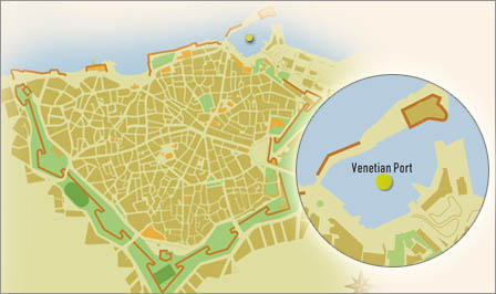 The Venetain port acquired its final form in the 16th or 17th century. Then as now, the entrance was dominated by the formidable sea fortress commonly known by the Greek form of its Turkish name Kule ("tower"), which bears out the significance of the area in terms of defence. To the south and west lay the shipyards (arsenali), where the Venetians built and equipped ships for use in war and trade.